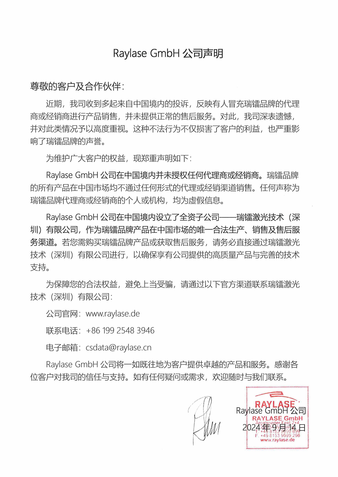 电话: +86 199 25 48 3946 地址:深圳市龙华新区观澜高新园区科姆龙科技园C栋9楼 传真: +86 755 82 22 8193 Email: csdata@raylase.cn